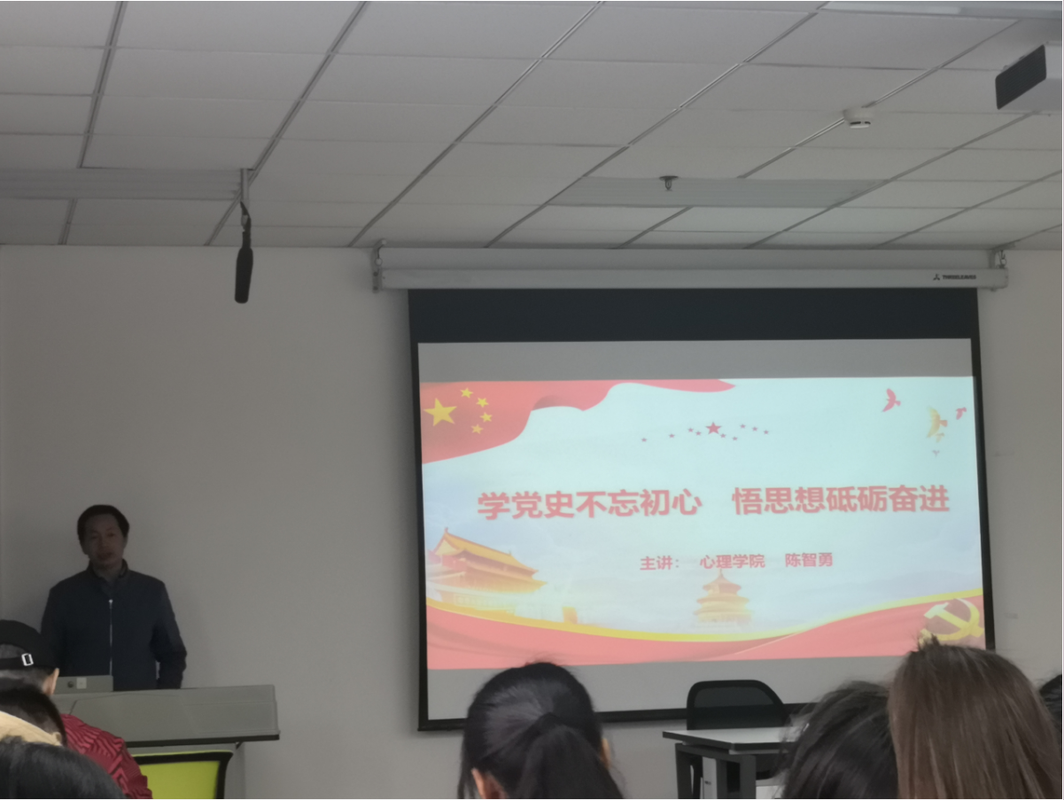 为提升党员的党性修养,加强学生党员对党史的了解和领悟,10月20日中午13:00,心理学院副院长陈智勇在综合实验楼405室为学院全体本科生党员讲授党史学习教育专题党课。