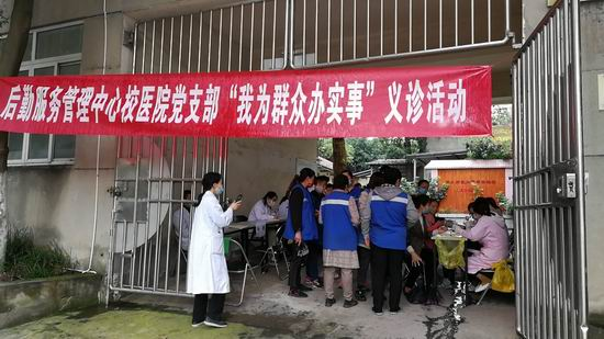 为深入推进党史学习教育,践行为民办实事1015日上午,由后勤服务管理中心党委统一部署,后勤校医院党支部组织的“我为群众办实事”义诊活动在能源通讯部院落内开展。后勤党委书记孙希红,党委副书记、纪委书记、工会主席梅勇和党委委员、综合科科长许勇莅临现场对参加义诊活动的医务人员表达谢意。校医院党支部书记、副院长蒲晓明,院长陈雪莲、副院长杨波组织党员业务骨干为主的各科专家及医护人员参加。