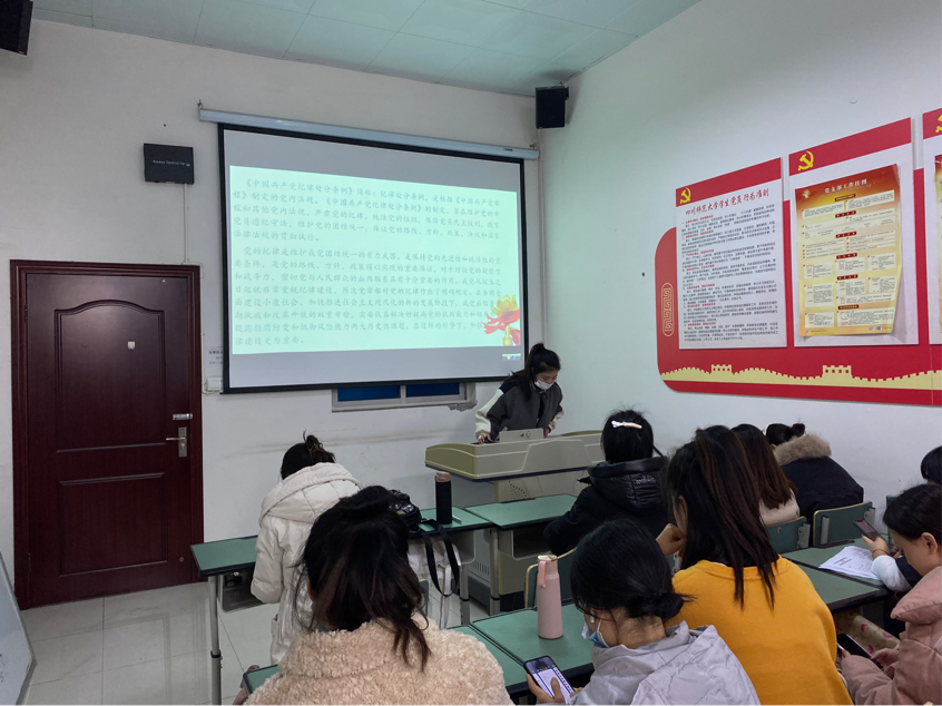 2021年12月13日中午12:30,舞蹈学院研究生党支部在学院407室开展“学习中国共产党纪律处分条例及中国共产党问责条例”专题组织生活。此次专题组织生活由党支部书记陈苗苗老师主持,2021级研究生党员邹艺璇同志担任领学,研究生党支部全体党员参加。