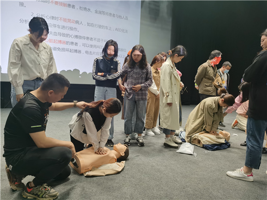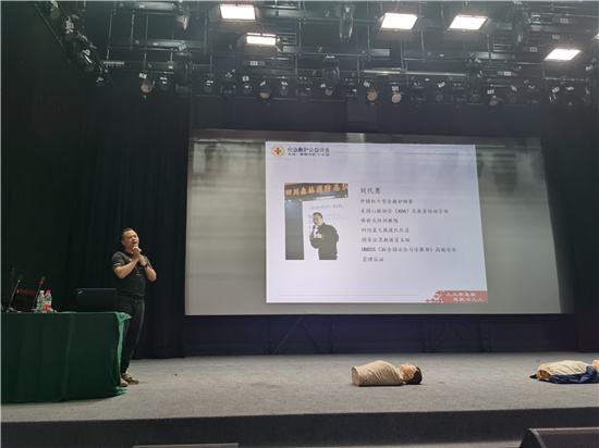 中国红十字会救护师、四川蓝天救援队队员刘代勇老师为大家讲解了现代救护新概念、心肺复苏以及自动除颤仪(AED)的使用等知识。在心肺复苏中强调了时间把握和正确操作方法的重要性,并亲自示范心肺复苏的施救过程。百说不如一练,只有在亲自实践后,同学们才能正确认识并掌握心肺复苏。培训过程中,大家踊跃实践,学习热情高涨,校医院的医务人员在旁边为大家积极解答疑惑及指导心肺复苏的正确操作。