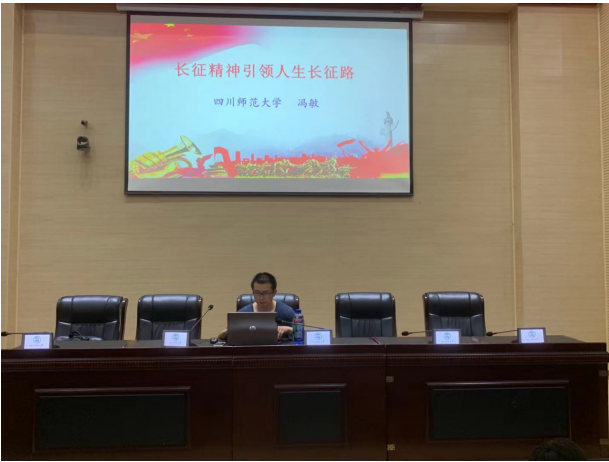 2021年6月12日晚19点,2021年四川省校园足球最佳阵容遴选高中男子甲组党史学习教育在四川师范大学成龙校区图书馆学术报告厅举行。图书与档案信息中心党总支委员、第一党支部书记冯敏老师为150多名高中同学讲授了题为《长征精神引领人生长征路》的党课讲座。