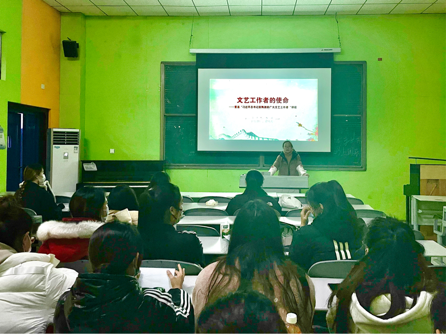 李欢老师从与时代同步伐、植根人民沃土、坚守艺术理想、追求徳艺双馨四个方面作了重点阐释。她指出作为文艺工作者要坚持全心全意为人民服务的宗旨,满足人民精神文化需求,把人民作为文艺表现的主体,才能创作出好的文艺作品。她希望大家坚守艺术理想,不忘初心,培养自己讲好中国故事的能力,作出打动人心的作品。