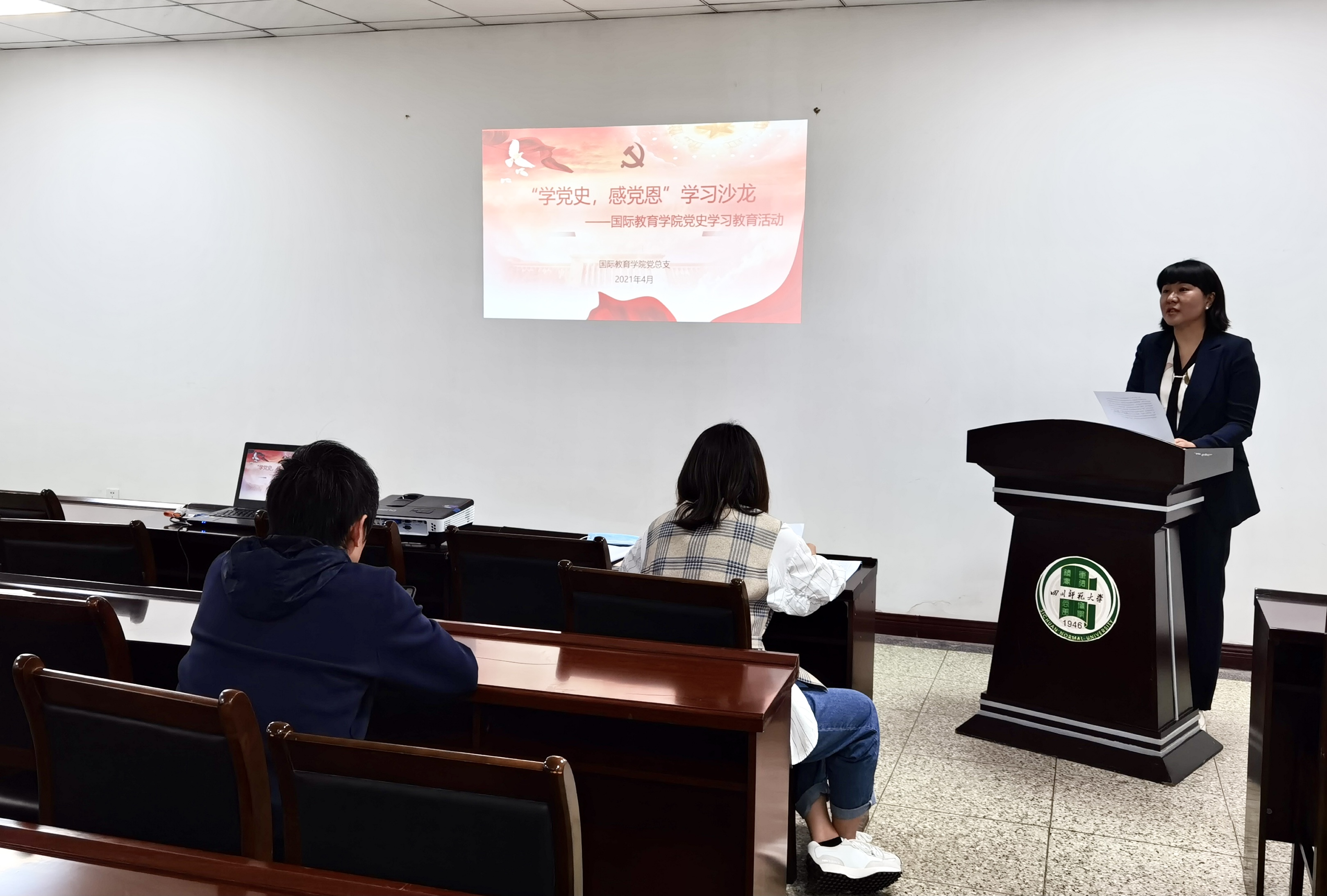 为积极响应校党委开展党史学习教育活动的号召,2021422日下午2:30,国际教育学院在嘤鸣园C102室开展了政治学习暨学党史、感党恩学习沙龙活动,学院全体教职工参加此次活动,活动由党务秘书宋延媛同志主持。