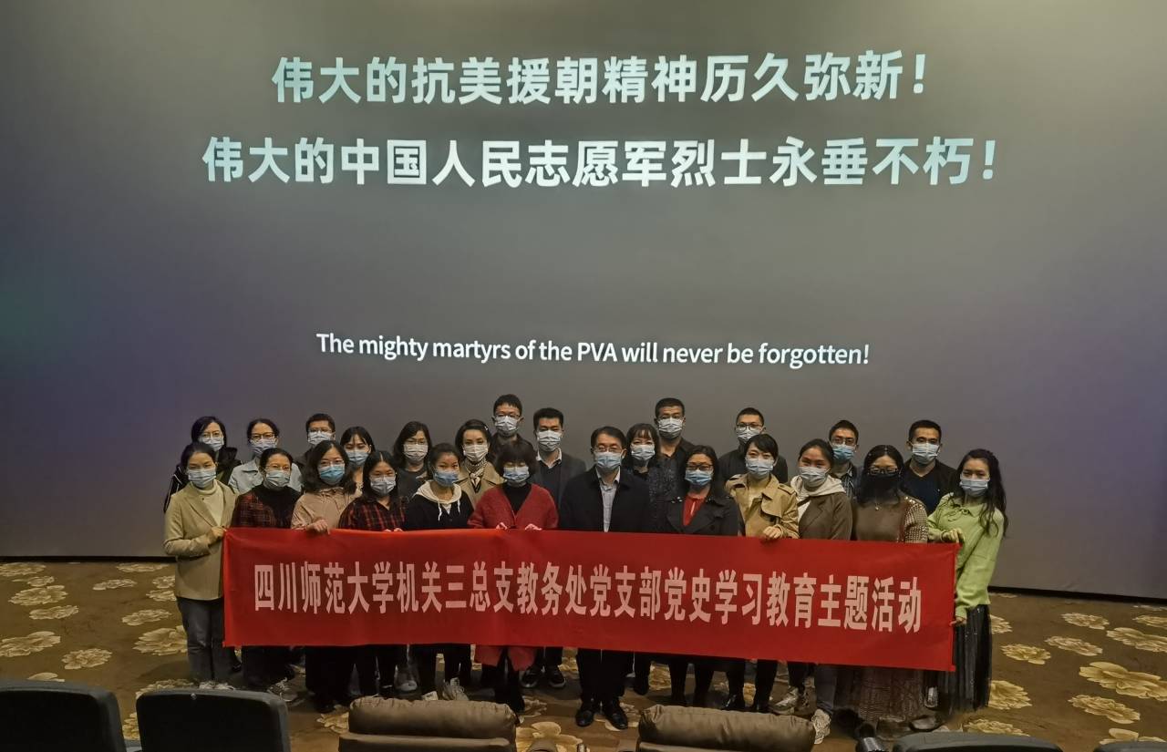 为深入学习贯彻习近平总书记“七一”重要讲话精神,弘扬中国共产党伟大建党精神, 2021年10月21日下午,教务处党支部开展“铭记历史 致敬英雄 ”主题党日活动,组织全体党员同志观看红色影片《长津湖》。