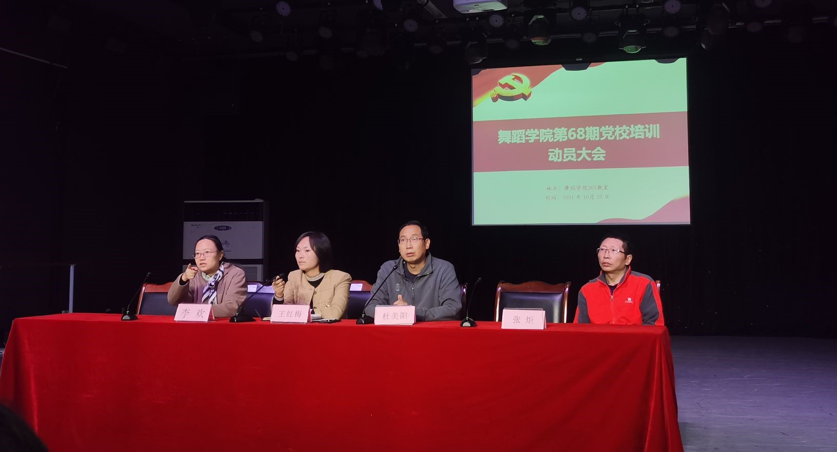 动员会首先由学工办主任、本科2017级党支部书记杜美阳从重视党校学习,严守纪律出发做出指导。他指出各位同学应当严格要求自己,学习上刻苦钻研,提高政治理论和思想觉悟,并且按时完成党校所教的学习任务,用党员的要求来要求自己,重视学习成果,最终希望所有人都能圆满结业。党委副书记王红梅从端正态度,深入学习,发扬优良精神三个方面出发做动员,她指出应当端正态度,提高自我认知,加强自我教育,每个人不仅代表自己,也代表整个舞蹈学院的精神风貌。她要求每位同学不仅要专业知识强,更要注重全面发展,不断提高自身综合素质。并指出作为新时代大学生须做到深入学习,补齐短板,重视理论的提升,传承优秀的传统文化,在未来的竞争中居于领先地位。要求大家应当发扬建党精神,发扬民族精神,发扬专业精神,注重学习成果的转化,将培训与党史学习相结合,树立为人民服务的人生目标,是党和人民对当代大学生的要求和期望,也是大学生成长、成才的内在要求。最后,她希望参加培训的同学珍惜学习机会,切实将培训与党史学习相结合、将党史学习与专业结合、将学习与实践相结合,以最好的状态展现舞蹈学院学生风采;最后,预祝参加培训的同学都有所收获。