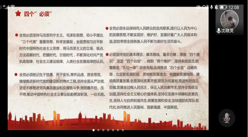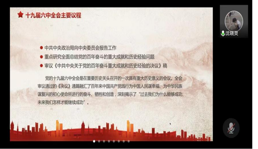 首先,沈晓灵同志对党的第十九届六中全会重点内容、主要议程进行介绍,主要有以下几个方面:围绕一条主线进行展开,总结了党的百年奋斗和历史经验;牢记中国共产党是什么,要干什么这个根本问题。接着,对本次大会的两个“确立”、三个“需要”、四个“必须”、五大“历史意义”进行讲解。随后,沈晓灵同志提到,当代青年要“勿忘昨天的苦难辉煌,无愧今天的使命担当,不负明天的伟大梦想。”我们坚信,在过去一百年赢得了伟大胜利和荣光的中国共产党和中国人民,必将在新时代新征程上赢得更加伟大的胜利和荣光。