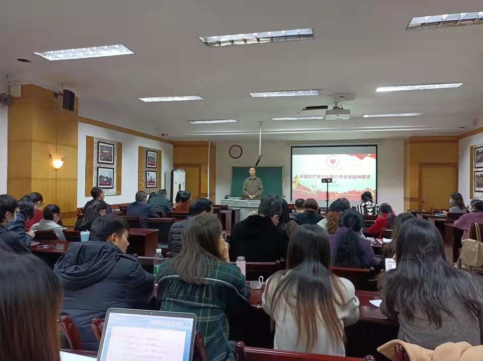 2021年11月25日14:30,为深入学习贯彻党的十九届六中全会精神,心理学院党委特邀原学校党委书记杨伯安做十九届六中全会精神学习解读报告。心理学院、脑与心理科学研究院全体教师在狮子山校区新松苑201会议室进行现场学习,我院学生党员以及全体积极分子在明德楼B区大教室进行线上学习。此次报告会由心理学院党委书记万英主持。