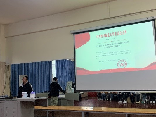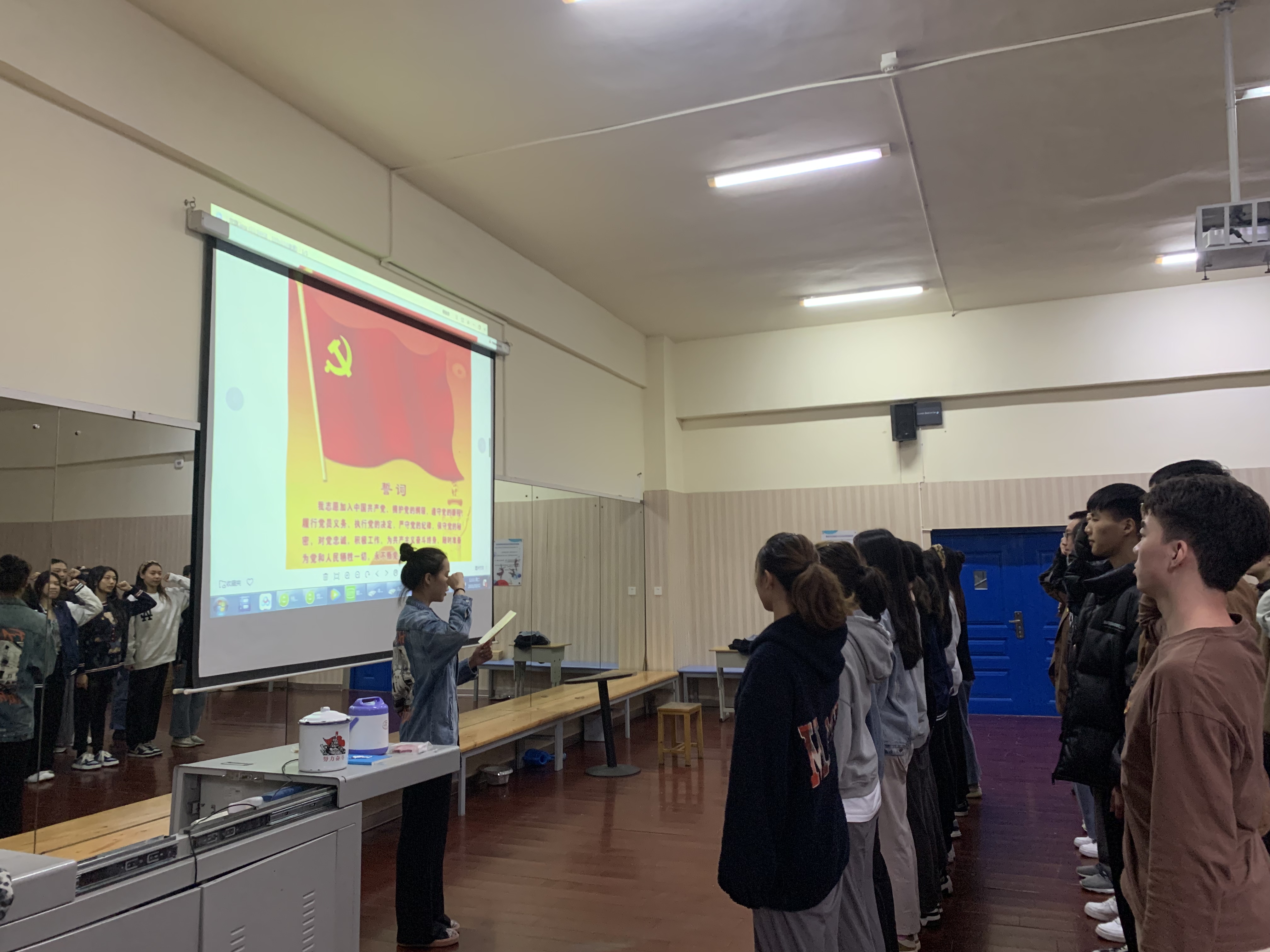 舞蹈学院2019级本科生党支部于2021年10月12日星期二中午12:00,在舞蹈学院102教室开展了专题组织生活,此次专题组织生活总共分为了三个部分:首先由张老师从发展党员工作的重要性、要求、程序等方面领习了《中共四川师范大学委员会发展党员工作实施细则》;其次由邓佳丽同志从辛亥革命的重要意义、如何发扬辛亥革命精神等方面领学了《习总书记在纪念辛亥革命110周年大会上的重要讲话精神》;最后是对第二批预备党员进行了入党宣誓仪式。专题组织会由党支部书记张炬同志主持。