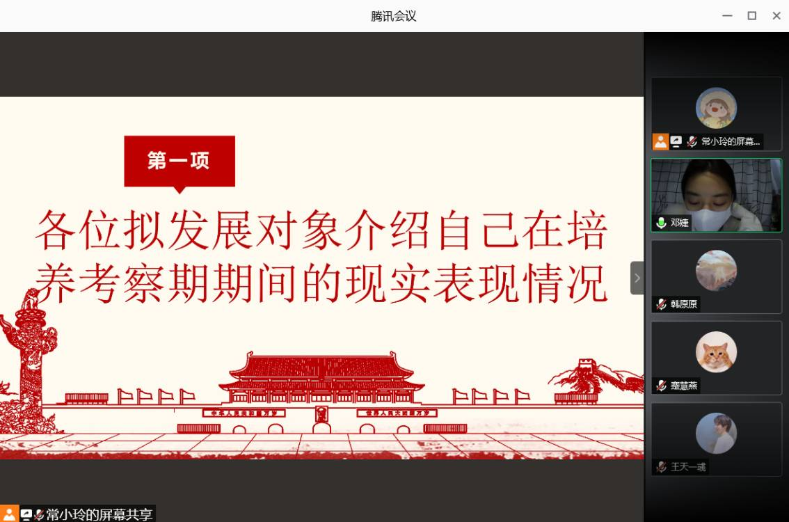 2021年11月12日晚上19:00,四川师范大学影视与传媒学院学生第一党支部在腾讯会议线上召开党员发展支部大会,讨论发展瞿泳淋、杨羽、左嘉怡、邓婕、刘睿、任思昱、张雯茜、冉敏、廖孟鑫、鲁天琦、温奇、翁佳妮、雷雪情、韩祯、泽准、王映心、周兴渝、李一正龙、李紫怡、邱春钰、刘郡汐、鄢诗洁、周凯、唐月华、刘馨丹、肖璐等26位同志为中共预备党员,支部全体党员和部分入党积极分子到会,会议由支部书记华小凤同志主持。