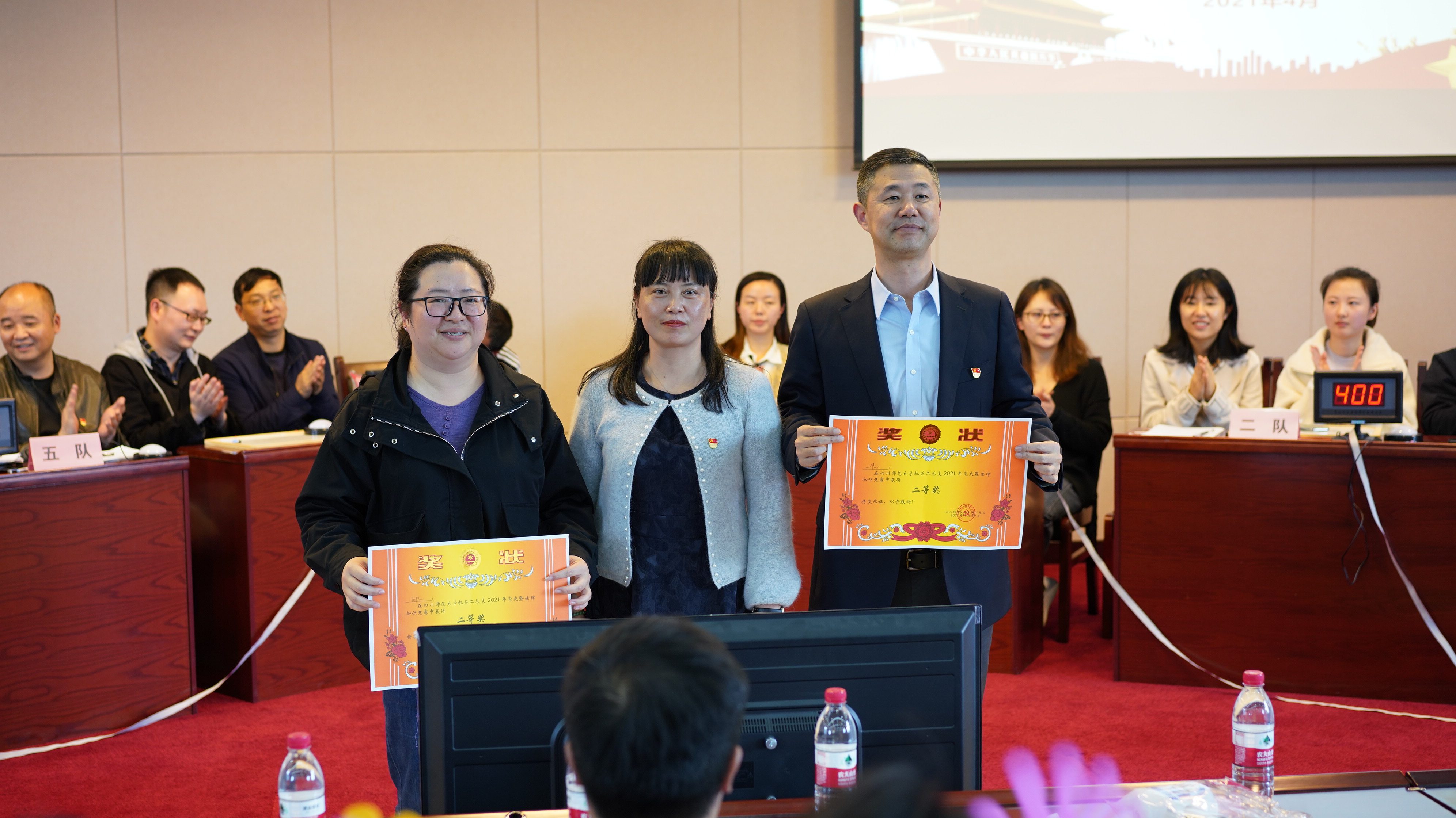 为深入学习贯彻落实习近平总书记在党史学习教育动员大会上的重要讲话精神和他在主持中央政治局第二十次集体学习时就贯彻实施《民法典》的重要指示,进一步提高教职工的学习党史知识、提升法律意识的积极性,2021年4月19日下午在明德楼四楼报告厅,机关二总支以知识竞赛的形式组织教职工深入学习党史和法律知识。出席本次活动的有学校党委常委、副校长张海东、学校党史法律专家张绍平教授、机关二总支书记伍琴。二总支全体教职工参与了本次竞赛。