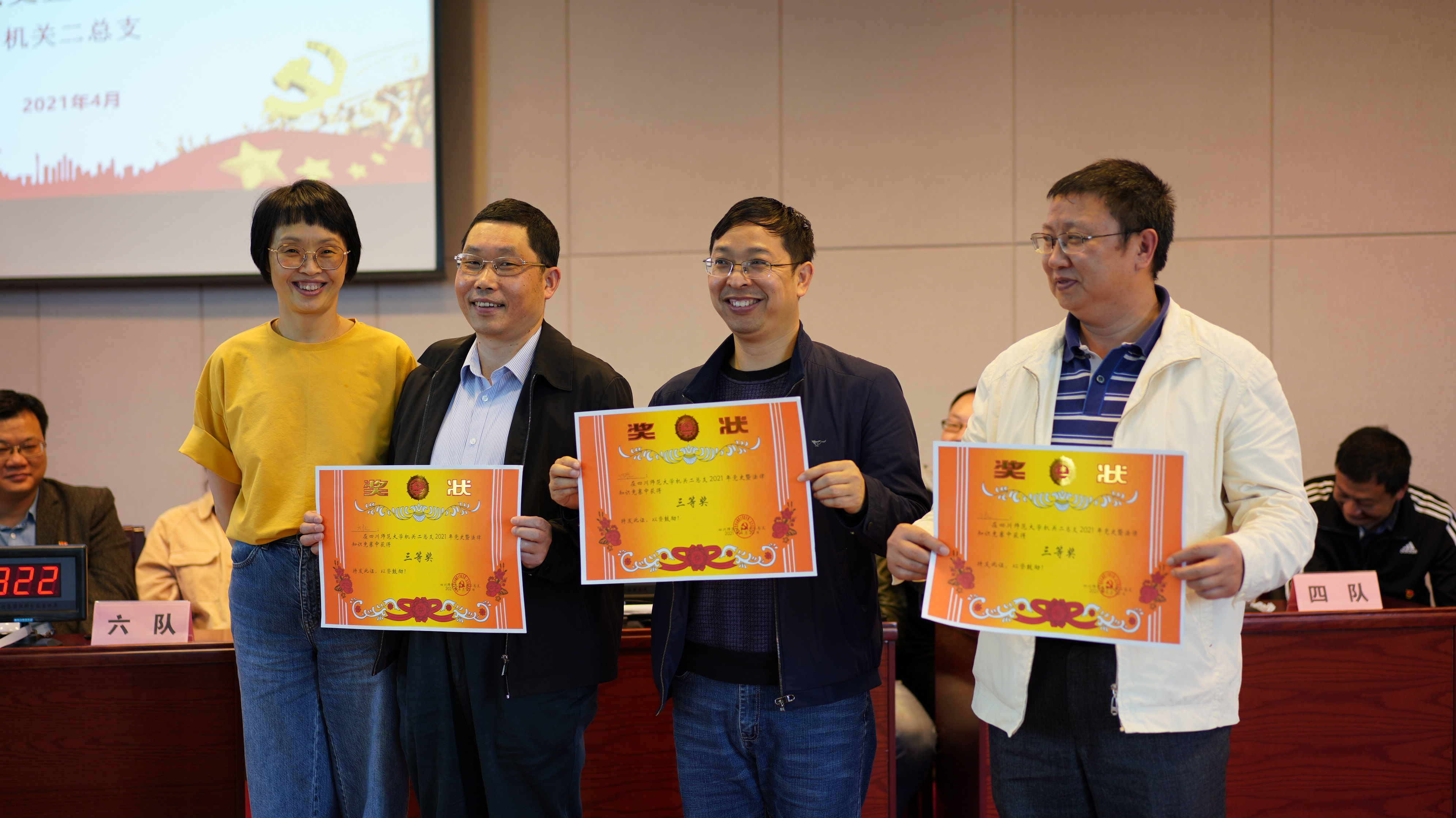 随后,知识竞赛正式拉开序幕。首先进行的是团队比赛,团队赛中,全体教职工被分为6个团队,每队选出3人作为参赛选手,该项比赛又分为必答环节、抢答环节和亲友团答题环节三轮,以三轮比赛的总分计算团队赛的最终得分。