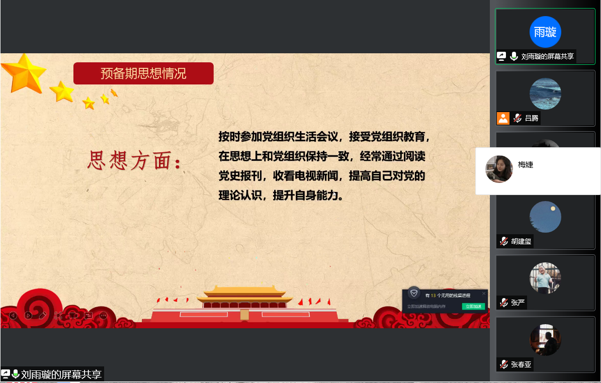接着,支部大会对以上九名党员的转正申请进行了充分讨论,一致认为:赵羚淞等九位同志在预备期间能以党员的标准严格要求自己,刻苦钻研学业,已具备中共党员的标准。参会的正式党员也通过线上投票的形式进行无记名表决,九名同志均获得全票赞成,同意按期转为中共正式党员。