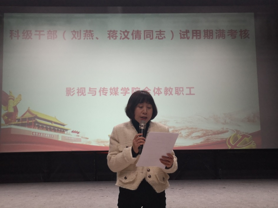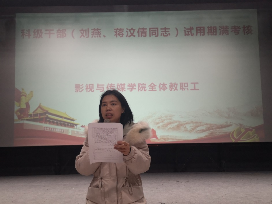 根据《党政领导干部选拔任用工作条例》《干部选拔任用工作监督检查和责任追究办法》等有关规定, 2021年12月16日下午,影视与传媒学院在综合实验楼701演播厅开展了科级干部试用期满考核民主测评会。会议由党委书记班运翔同志主持,学院全体老师参会。