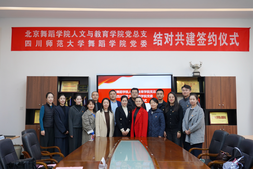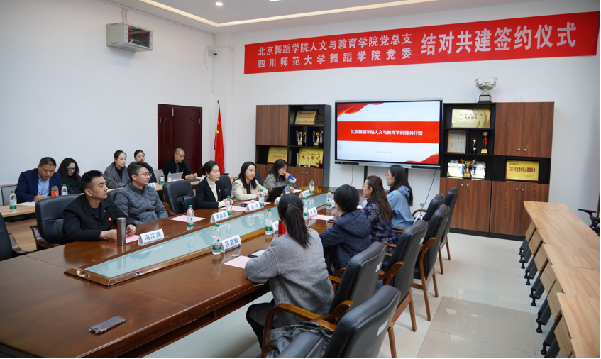 结对共建座谈。在学院 513 学术研讨中心,北京舞蹈学院人文与教育学院党委与四川师范大学舞蹈学院党委举行结对共建座谈会,四川师范大学舞蹈学院党委书记刘洋主持会议,双方正式签订结对共建协议。
