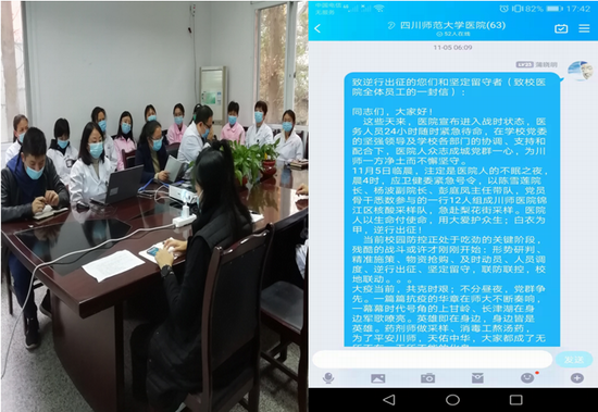 11月4日,校医院组织全体员工参加疫情防控工作动员部署会,陈雪莲院长宣布进入战时状态。医院党支部随即发布了抗疫动员“致逆行出征的您和坚定留守者”,设立党员先锋岗,佩戴党徽亮身份,号召全体党员以身示范勇于担当;鼓励全体员工团结一心,尽快打赢疫情防控阻击战。同日,校医院接到锦江区卫健委抽调核酸采样人员的紧急通知,要求立即选派业务素质好、工作能力强、身体健康的医务人员组成核酸采样队随时待命支援核酸采样任务。疫情就是命令,在校园防疫任务艰巨,人员不足、物资紧张的情况下,医院支部连夜紧急动员全体员工,启动应急方案;陈雪莲立即安排布置相关工作,召集人员、准备物资、整装待命。