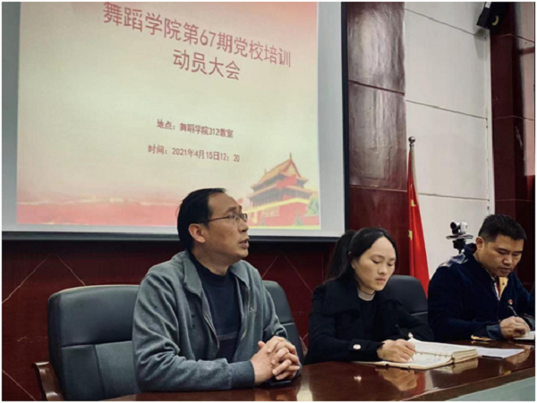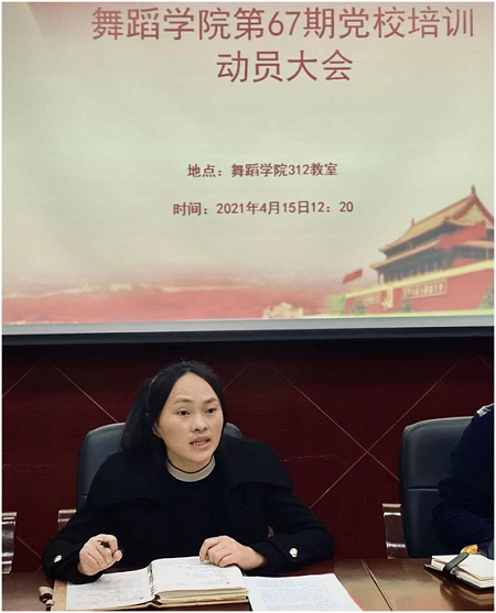 动员会首先由学工办主任、本科2017级党支部书记杜美阳从重视党校学习、严格学习纪律、重视学习效果、提升培训考核等四个方面做动员。党委副书记王红梅从端正态度、学出深度、学出效度三个方面做动员,她指出要切实把学习的效果转化到三个维度:自我示范性的增强、学院荣誉感的提升、班级服务能力的提高。她希望参加培训的同学珍惜学习机会,切实将培训与党史学习相结合、将党史学习与专业结合、将学习与实践相结合,以做好的状态展现舞蹈学院学生风采;她预祝参加培训的同学学有所获。